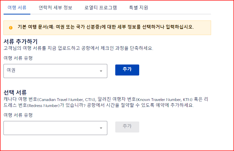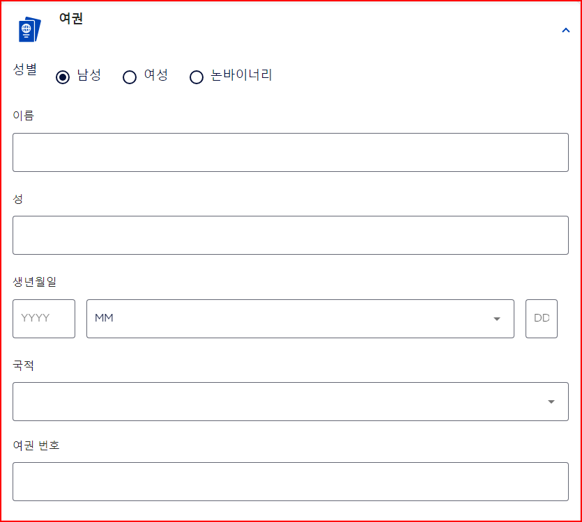 3) 이제야 보통 항공료 결재 전 입력해야 하는 여권 정보를 기입합니다.