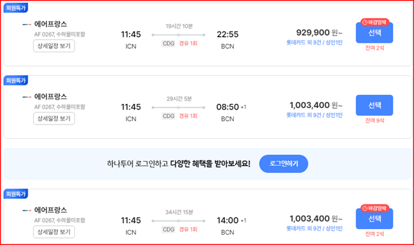 제가 예약한 항공편과 출발편은 동일합니다. 하지만 가격차이가 약7만원 정도 나고 신용카드에 따라 가격이 더 올라가는 것 같습니다.