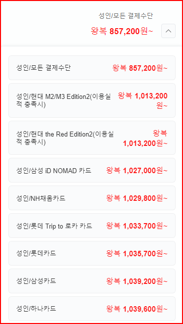 제가 구입한 것과 출발편은 똑같고 귀국편이 다릅니다. 실제 결제해야 하는 금액이 신용카드 별로 상당한 차이가 납니다.