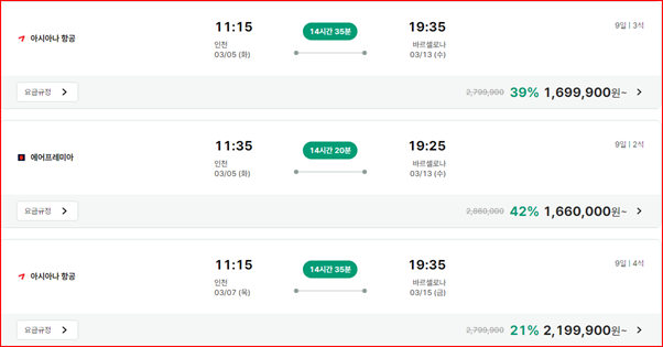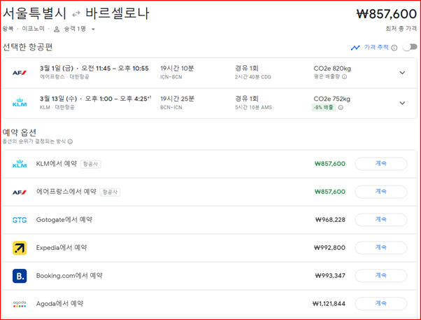 일단 결론은 구글 항공 검색으로 가장 원하는 정보를 얻었습니다. 위의 이미지에서 확인 할 수 있듯이 바르셀로나의 경우 항공사에서 직접 구매하는 게 가장 가격이 저렴 했습니다.
