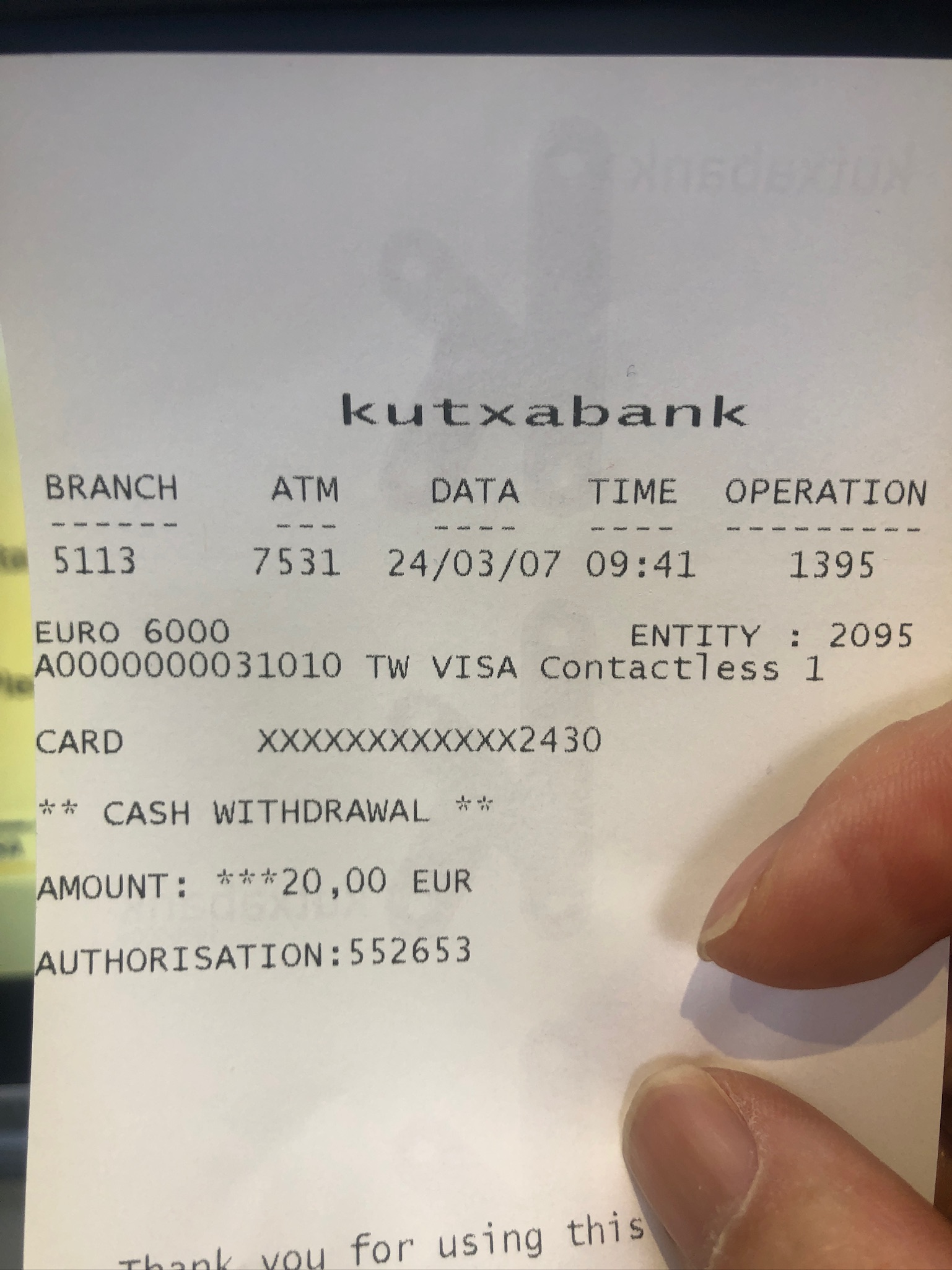 오른쪽 전표 표시면 인출한 20유로 이외에 어떠한 비용도 청구 되지 않았습니다.