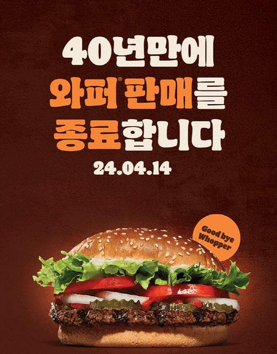 버거킹은 대표 메뉴인 직화로 구운 순 쇠고기 패티를 담은 와퍼를 지난 8일 홈페이지와 소셜네트워크서비스(SNS)에 '40년 만에 와퍼 판매 종료'란 문구의 공지를 올려 “4월14일까지 마지막 와퍼를 만나보세요”라고 안내했었습니다.