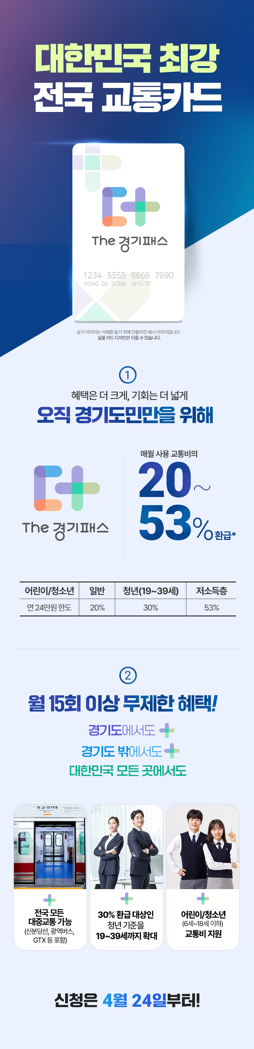 그리고 경기도는 청소년 교통비 지원 사업이 따로 있어서 18세 이하 청소년들에게는 연 24만 원 한도로 별도 지원합니다.