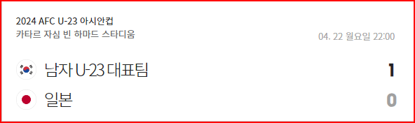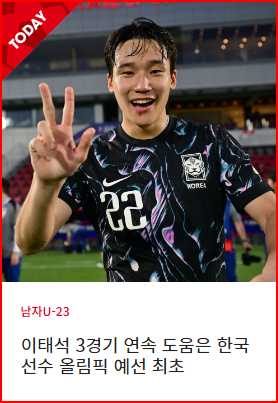 한국 U23 축구대표팀이 2024 파리 올림픽 아시아 최종예선을 겸한 2024 카타르 AFC U23 아시안컵에서 일본을 상대로 이태석의 코너킥을 받아낸 김민우의 골로 일본을 격파 했습니다. 이로써 한국의 10회 연속 올림픽 본선 진출에도 확신을 더했습니다.