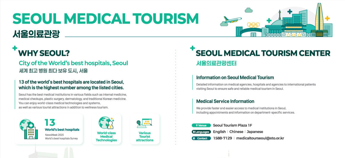 Seoul is known as a city densely packed with world-class hospitals and a center for medical tourism. Seoul's medical tourism centers provide various services for foreign patients, including excellent language support. Additionally, Seoul has 13 world-class hospitals, offering patients a wide range of choices.